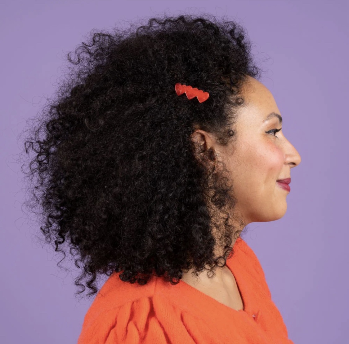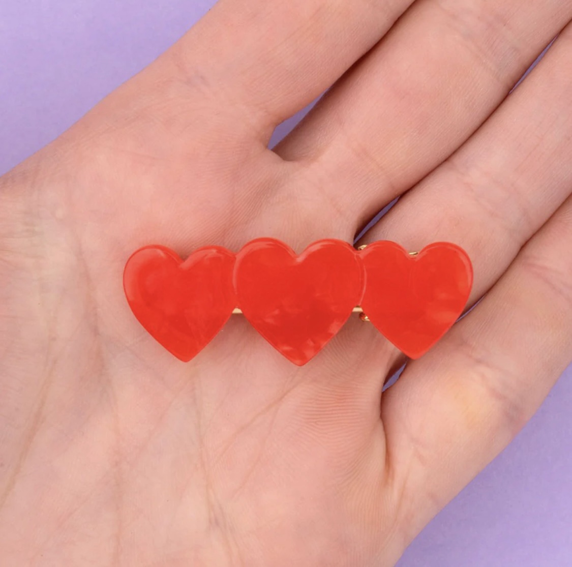 Ένα κλιπ μαλλιών διακοσμημένο με τρεις ζωηρές κόκκινες καρδιές για να προσθέσει μια πινελιά ρομαντισμού και χρώματος σε κάθε χτένισμα.
