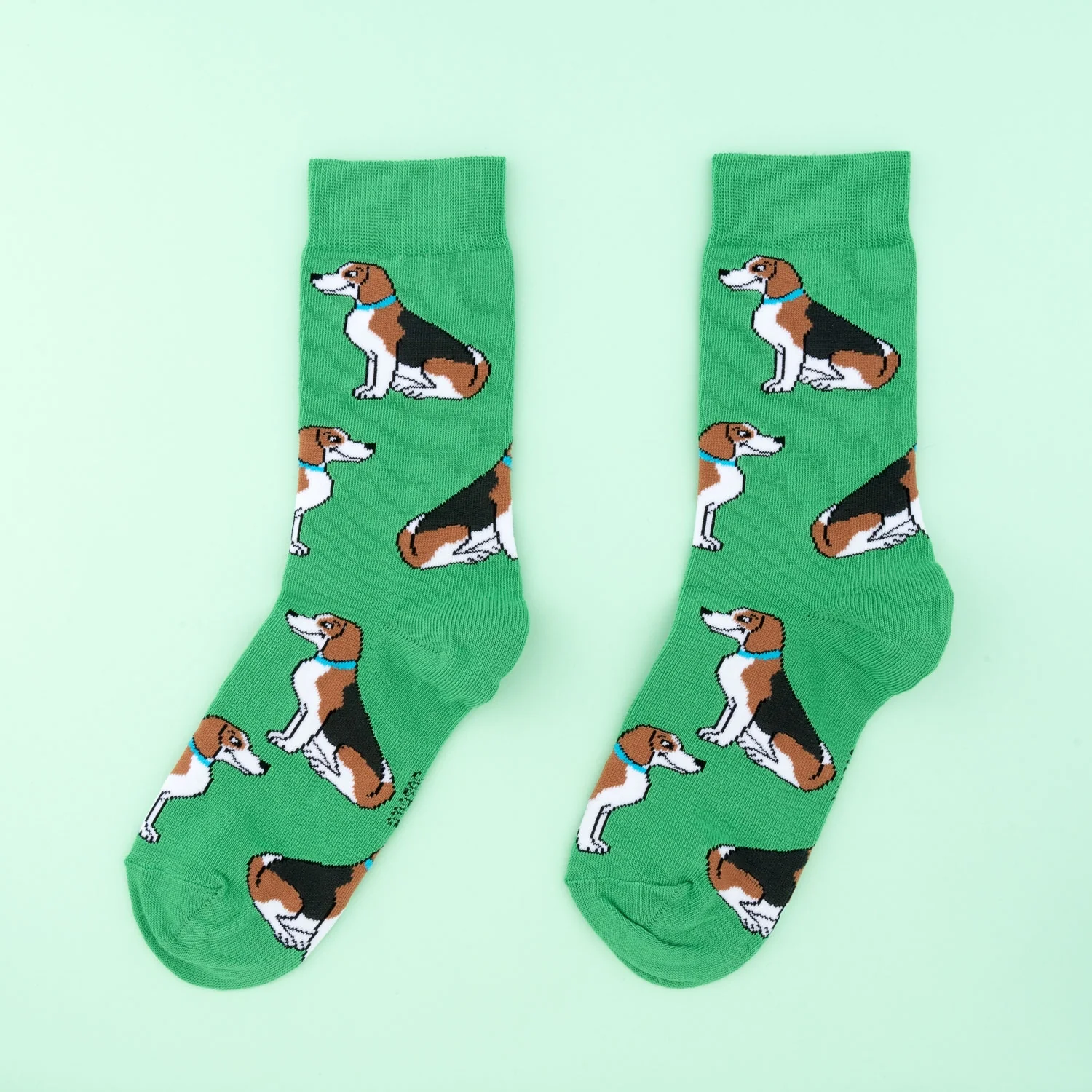 Βαμβακερές κάλτσες σε έντονο πράσινο χρώμα με μοτίβο Beagle – ένα ωραίο τρίχρωμο σκυλάκι με χαλαρά αυτιά.