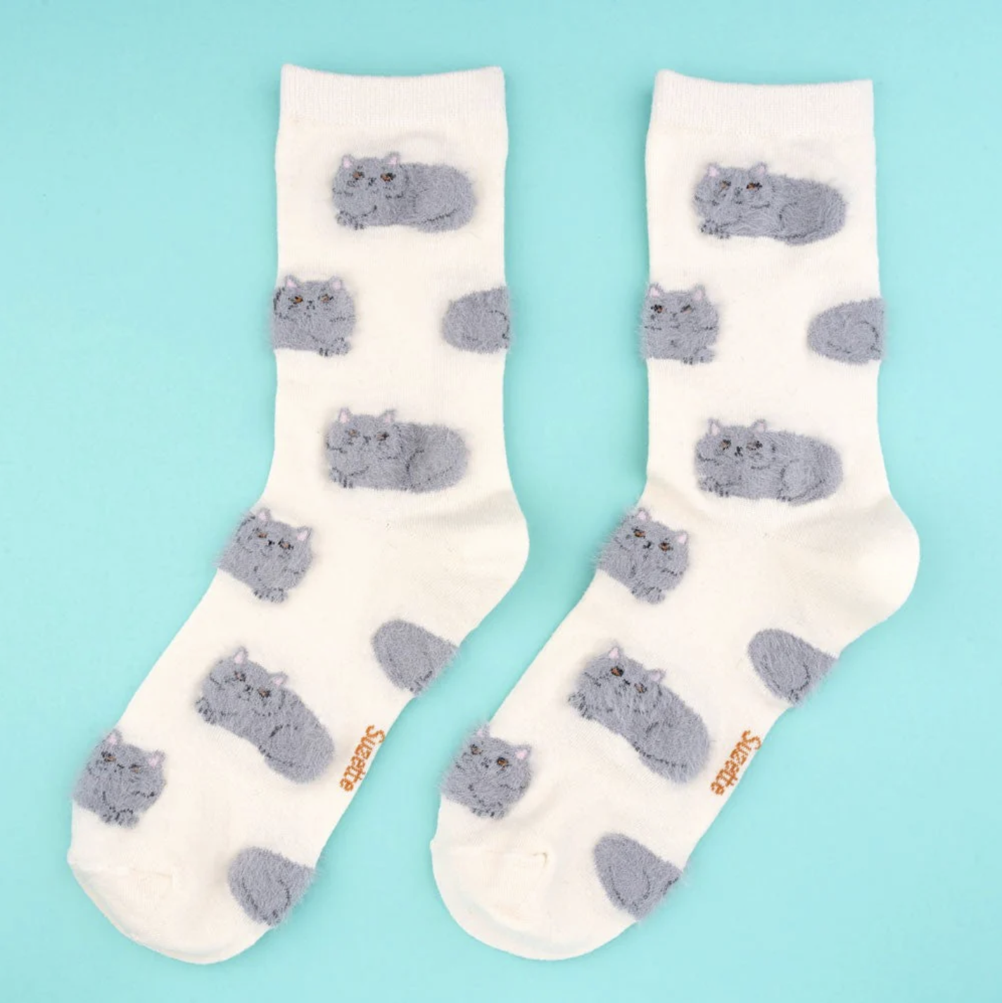 Πρωτότυπες κάλτσες σε εκρού χρώμα με γκρι χνουδωτές γατούλες.