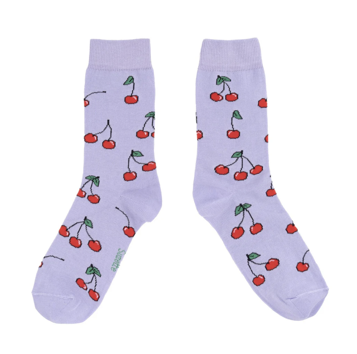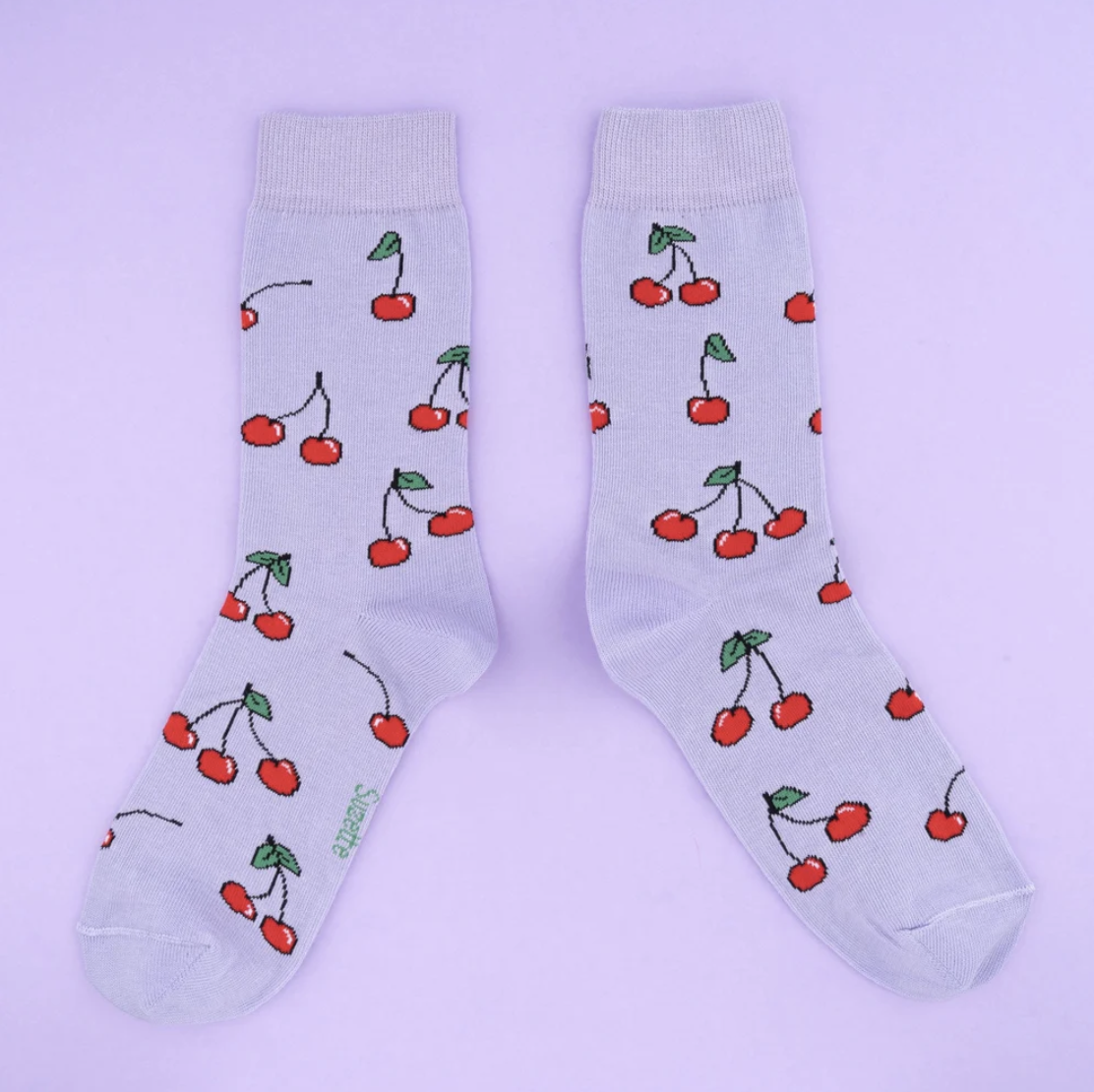 Αξιολάτρευτες μωβ κάλτσες γεμάτες κερασάκια.