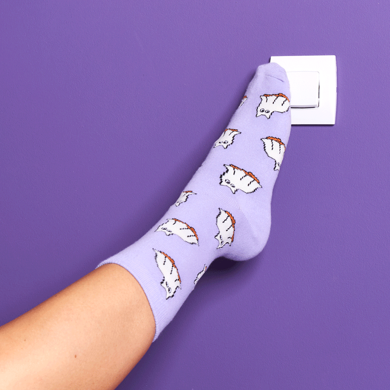 Πρωτότυπες κάλτσες με μοτίβο (όχι και τόσο τρομακτικό) γάτας-φάντασμα σε όμορφο μωβ φόντο.