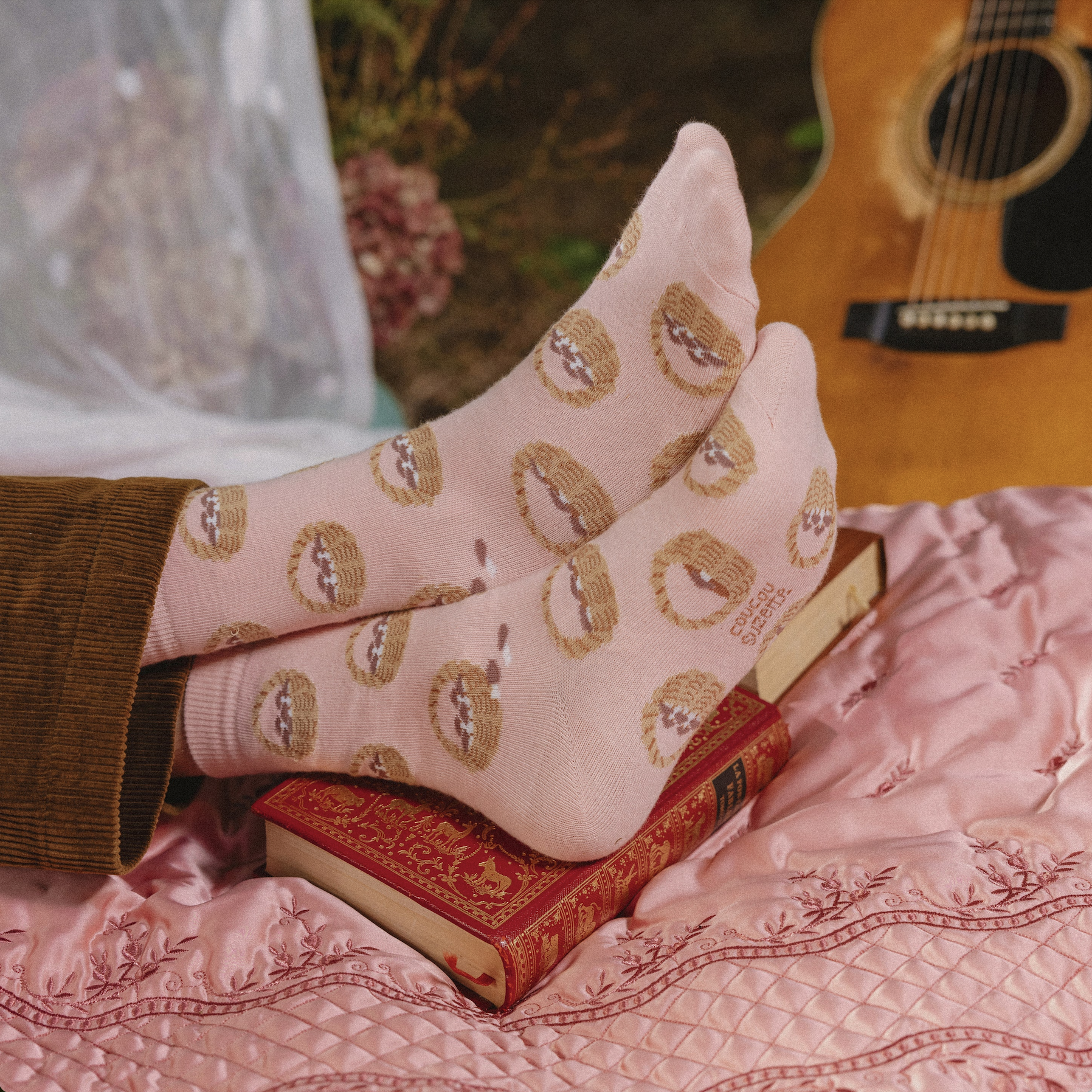 Κάλεσμα σε όλους τους λάτρεις των ιδιόρρυθμων καλτσών—ιδού ένα ζευγάρι καλυμμένο με καλάθια με μανιτάρια! Έχουμε ενθουσιαστεί με αυτούς τους μικρούς θησαυρούς του δάσους, τακτοποιημένους σε ένα όμορφο vintage ροζ φόντο.