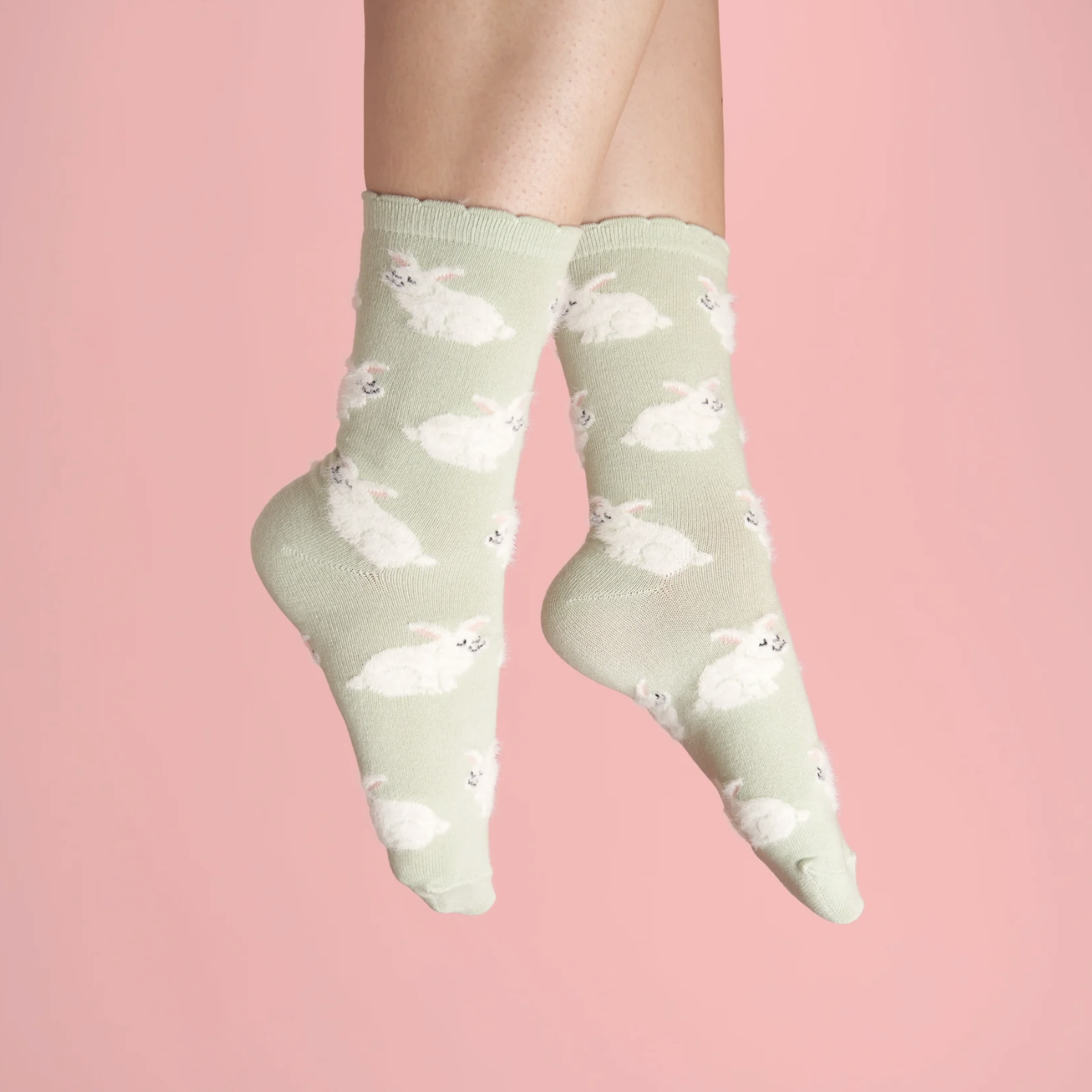 Πρωτότυπες κάλτσες στο χρώμα του φασκόμηλου με λευκά χνουδωτά κουνελάκια.