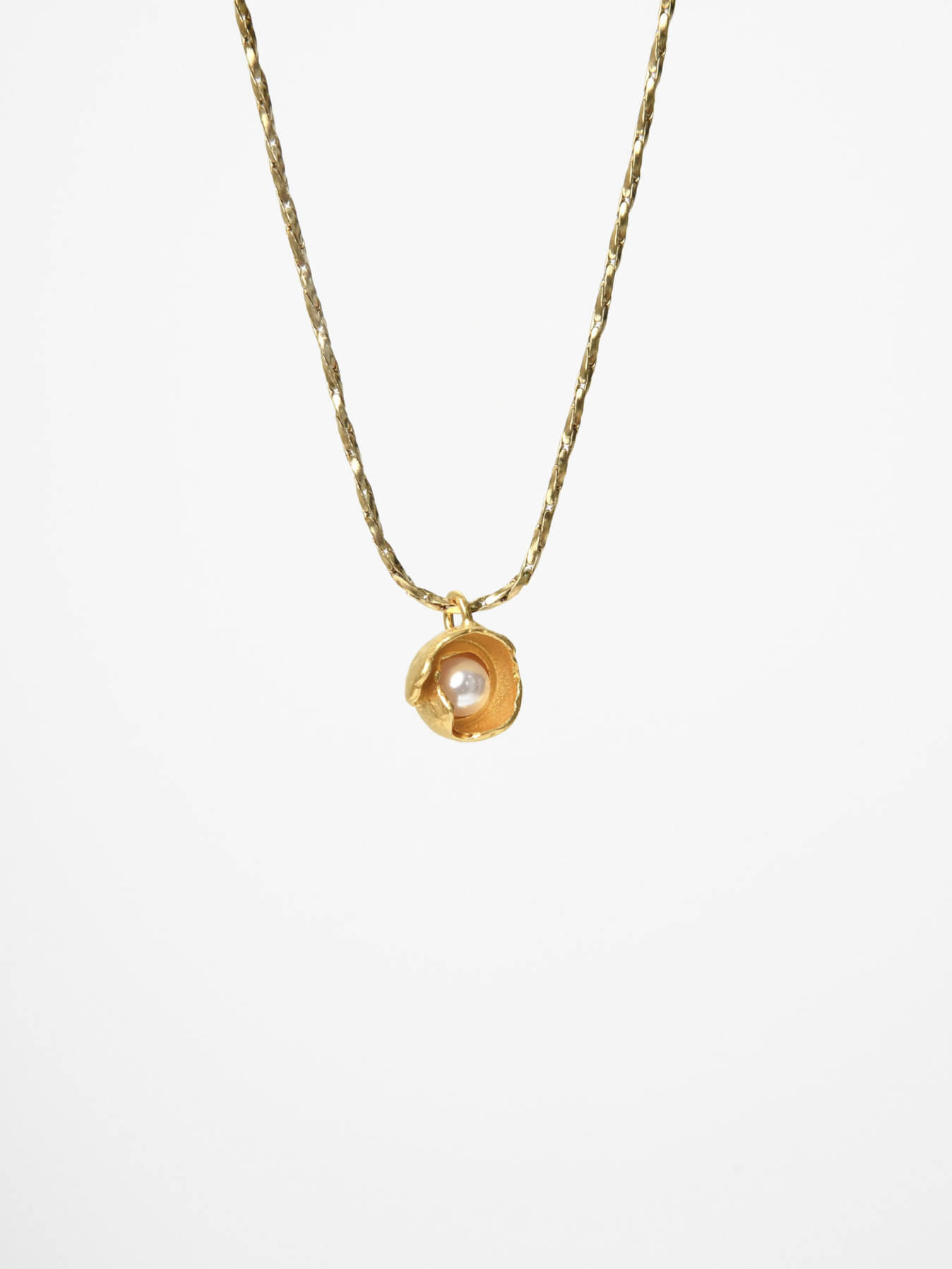 The design is made of 24k goldplated bronze with pearl stone. The chain is made of steel and the length is 45cm.