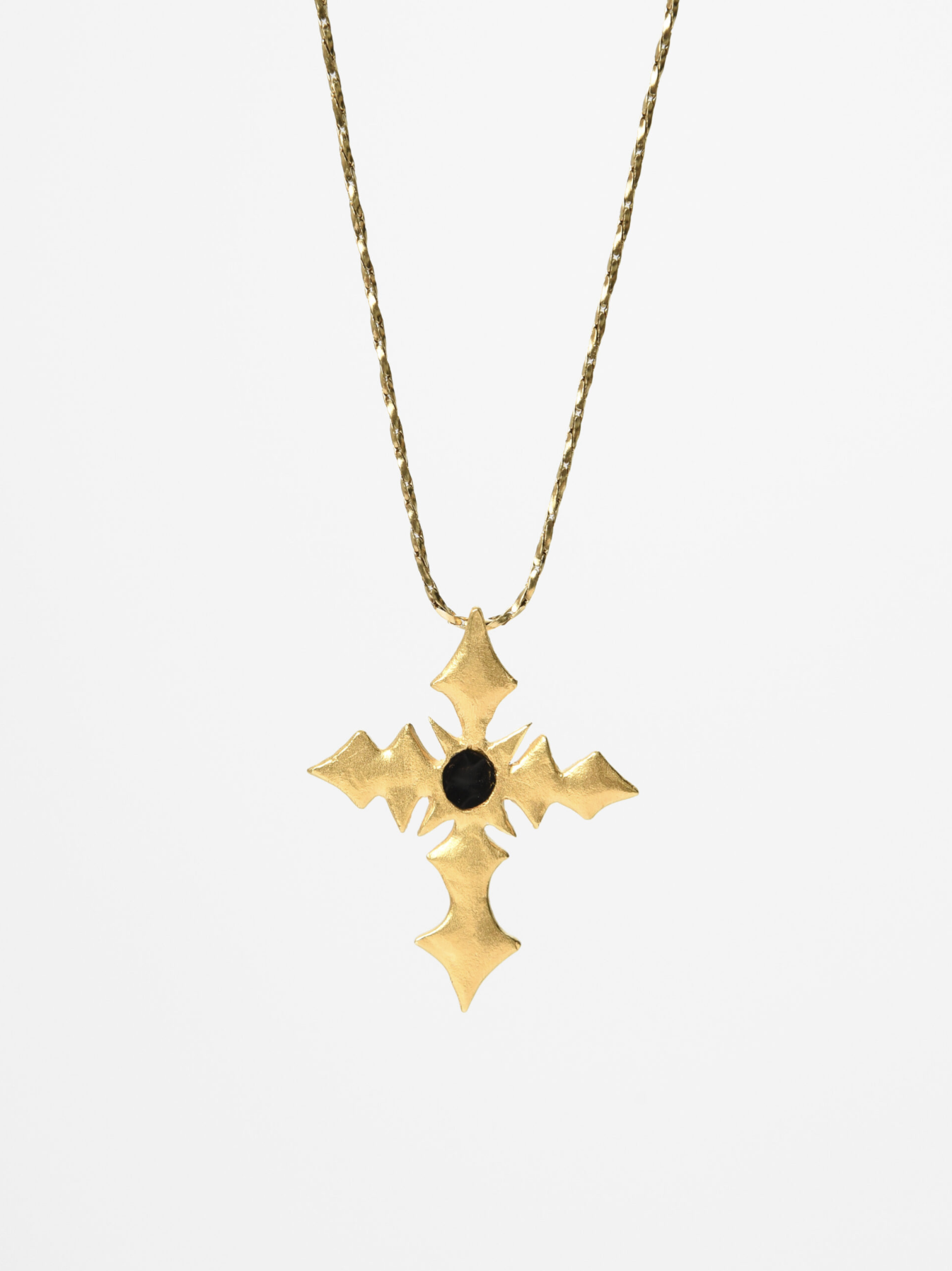 The design is made of 24k goldplated bronze with enamel. The chain is made of steel and the length is 50cm.
