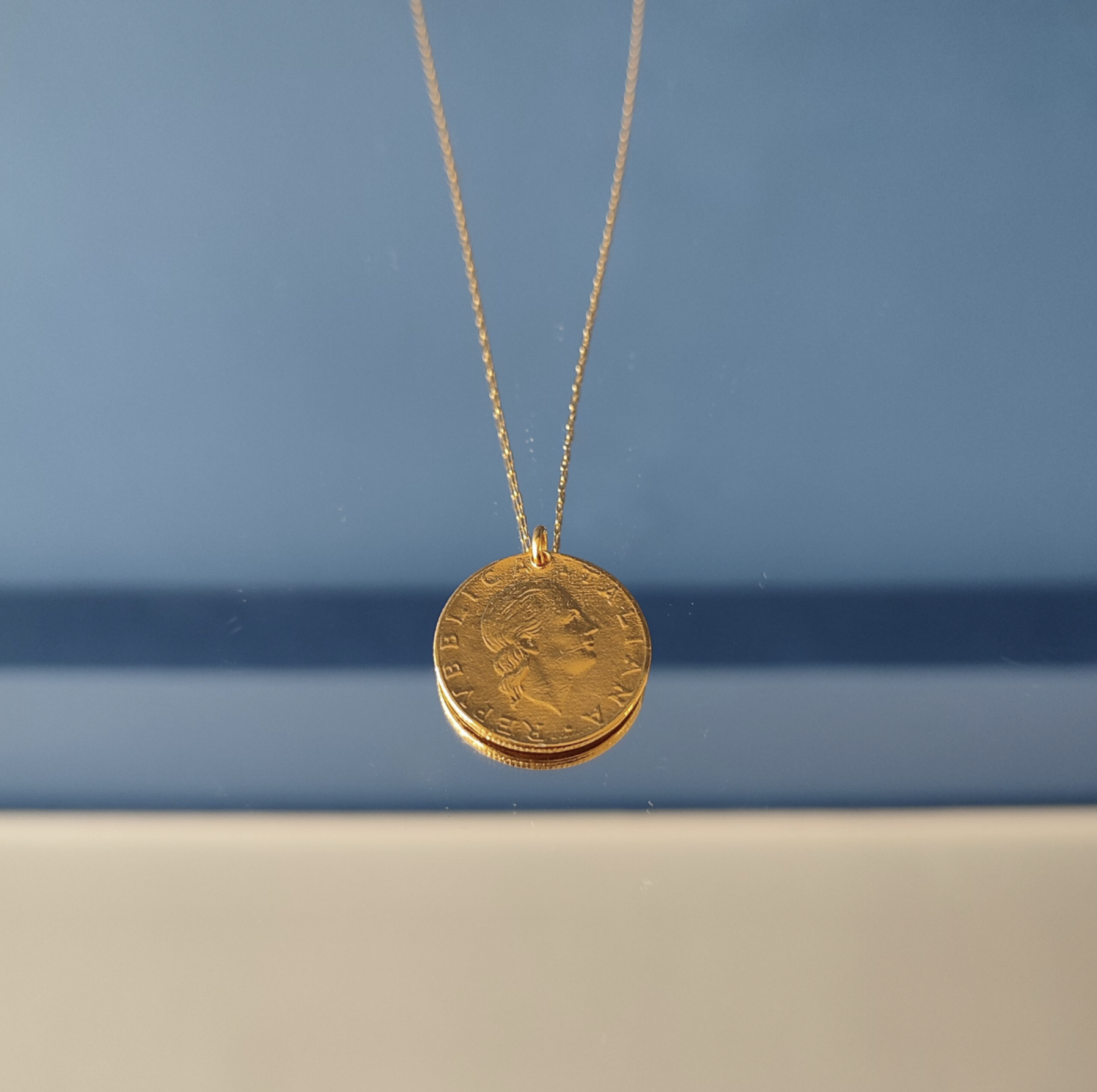 The design is made of 24k goldplated bronze. The lenght of the chain is 0,40cm & the diameter is 2,2cm.