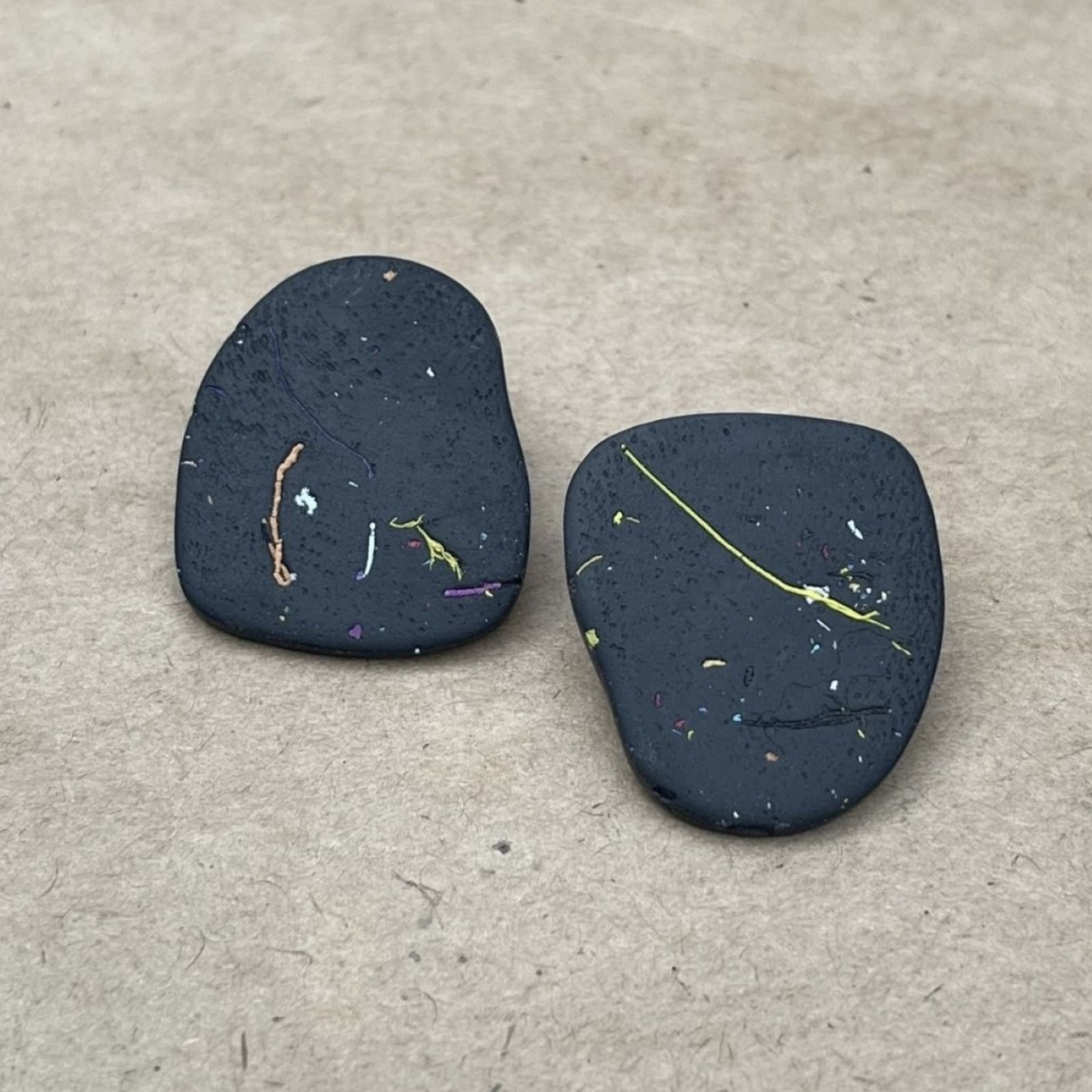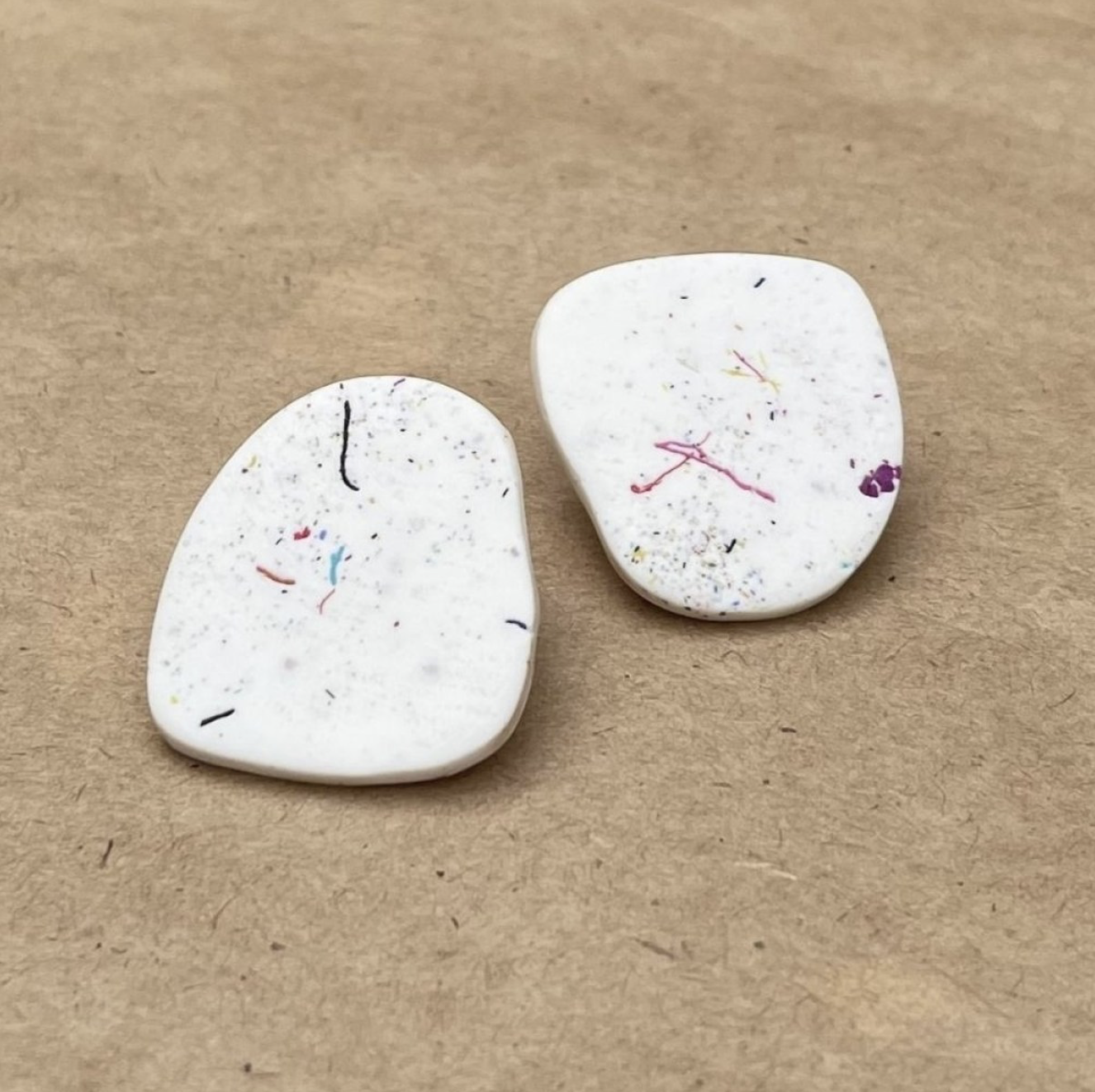 Ζήστε τη γοητεία αυτών των χειροποίητων σκουλαρικιών, σχεδιασμένα με ένα καλλιτεχνικό abstract σχήμα. Ελαφριά σαν φτερό, συνδυάζουν τρία όμορφα χρώματα με μια πινελιά από τρίμματα πολυμερικού πηλού, κάνοντας κάθε κομμάτι μοναδικό αριστούργημα.