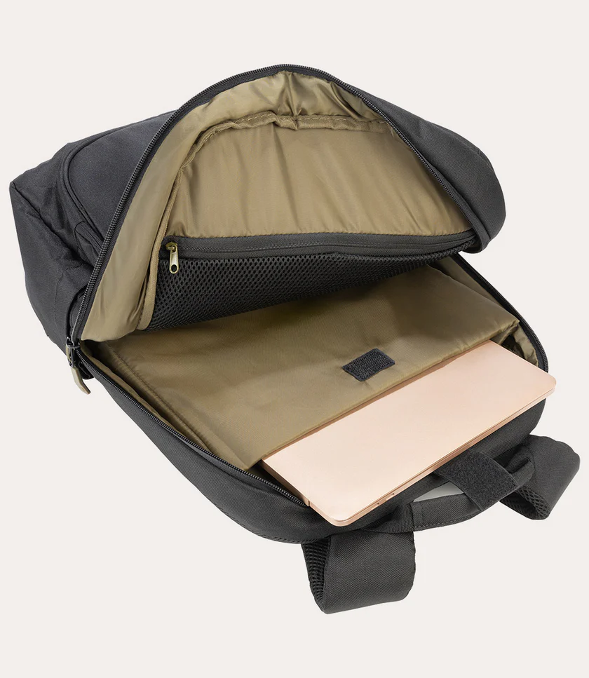 Κατασκευασμένο από υλικό που παράγεται από ανακυκλωμένο πλαστικό και εξοπλισμένο με το σύστημα AGS, ένα ελαστικό σύστημα ανάρτησης με ιμάντα ώμου σχεδιασμένο για να μειώνει το φορτίο στους ώμους και την πλάτη σας. Το επενδεδυμένο εσωτερικό διαθέτει διπλή τσέπη για την προστασία τόσο του φορητού υπολογιστή όσο και του tablet. Η μπροστινή πλευρά διαθέτει μια μπροστινή τσέπη με φερμουάρ, ενώ η πίσω πλευρά διαθέτει μια τσέπη ασφαλείας και έναν ιμάντα μεταφοράς. Στο πλάι του σακιδίου υπάρχουν δύο ευρύχωρες τσέπες για μια ομπρέλα και ένα μπουκάλι νερού. Τα φερμουάρ και η επένδυση είναι σε αντίθεση χρώματος.
