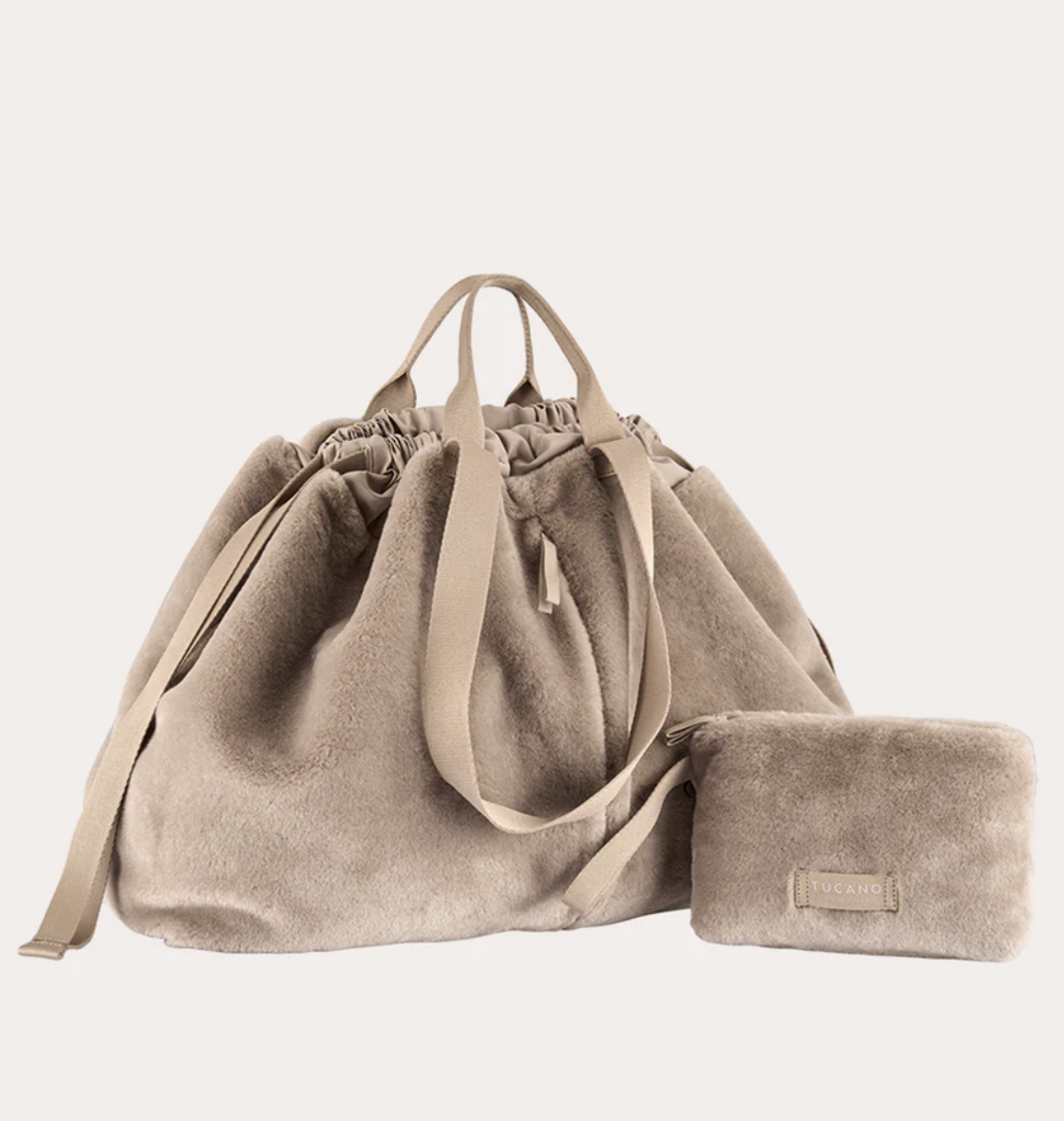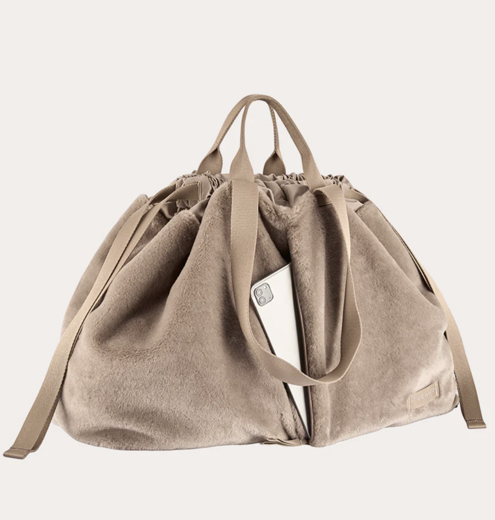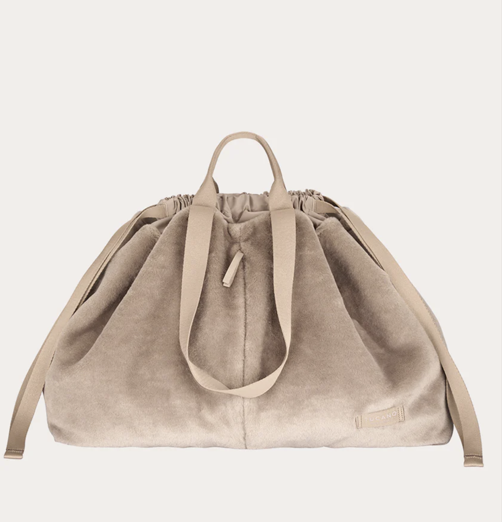 Shopper bag medium από μαλακή τεχνητή γούνα με διπλές λαβές και κλείσιμο με κορδόνι.