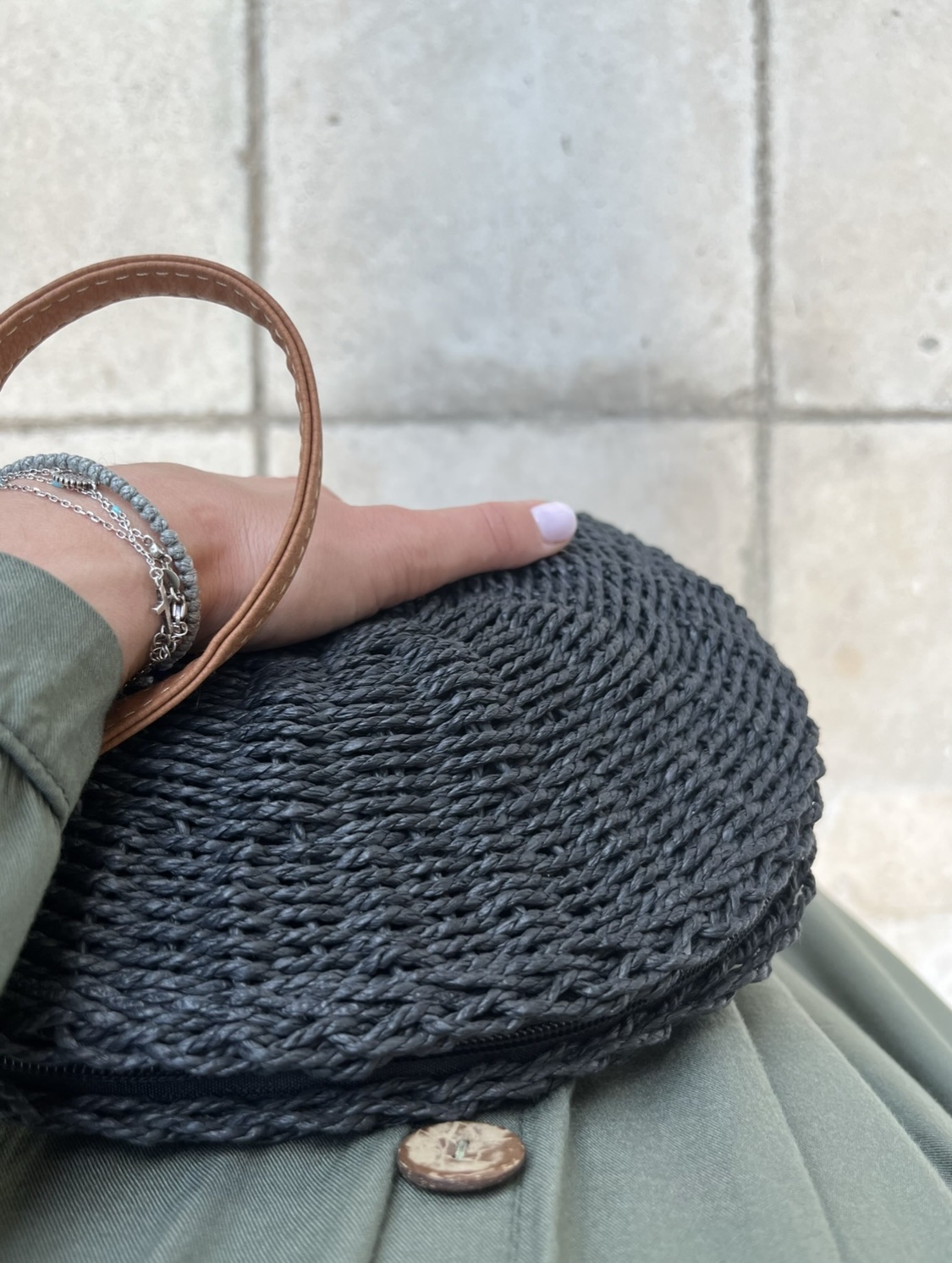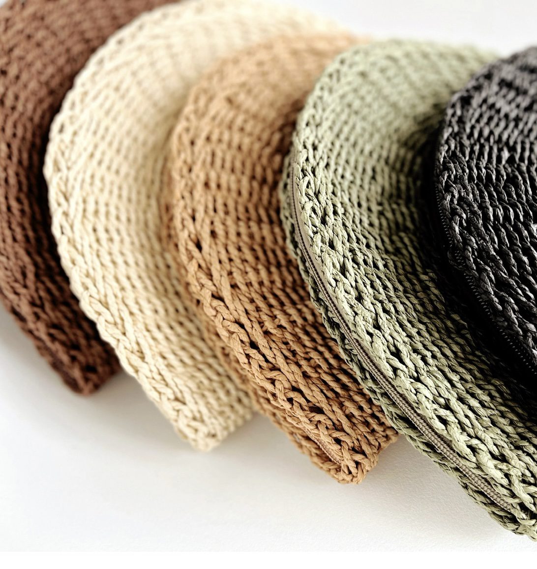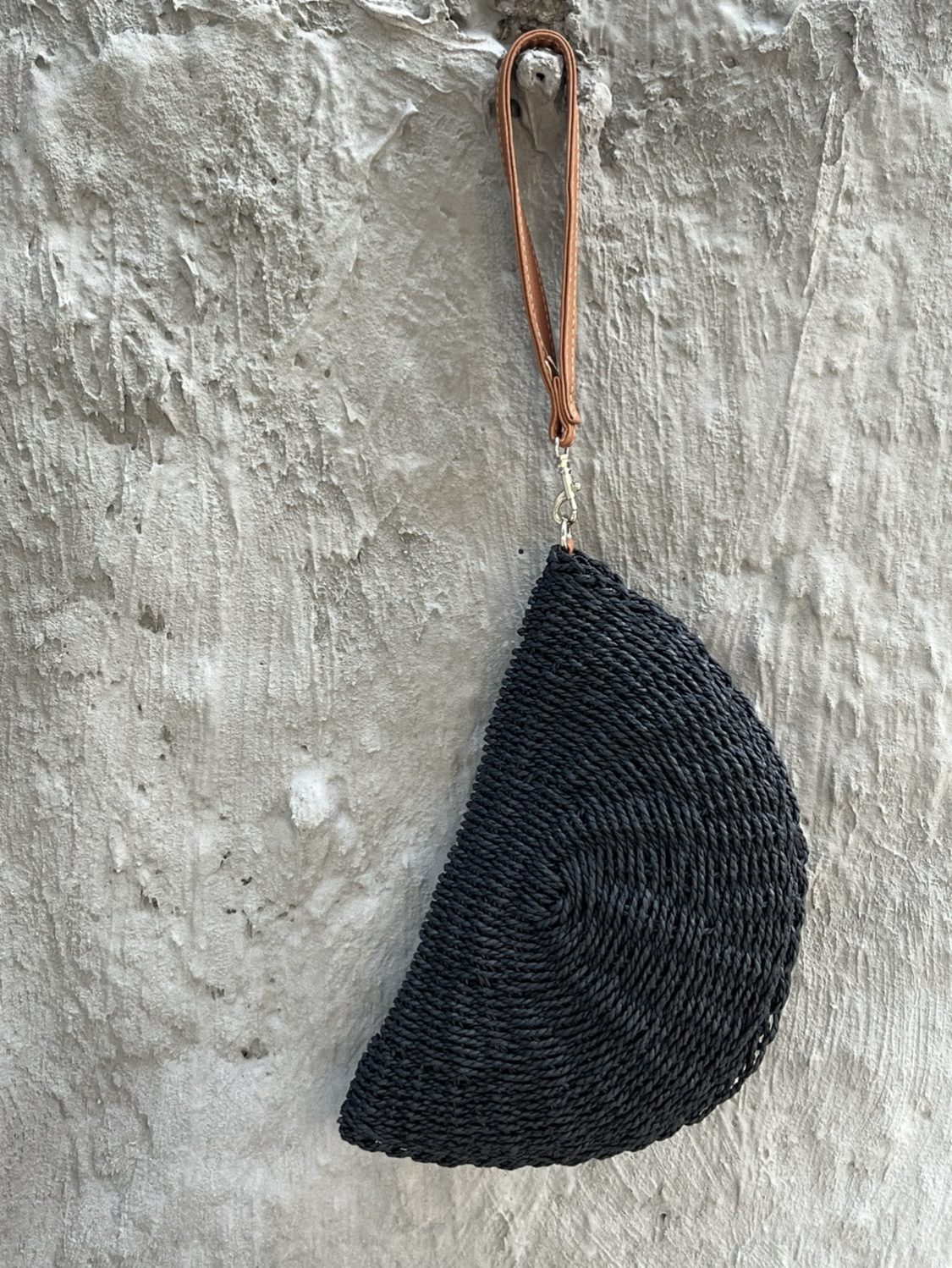 Τσαντάκι χειρός από ράφια σε σχήμα μισοφέγγαρου. Με εσωτερική φόδρα, κλείσιμο φερμουάρ και λουράκι.