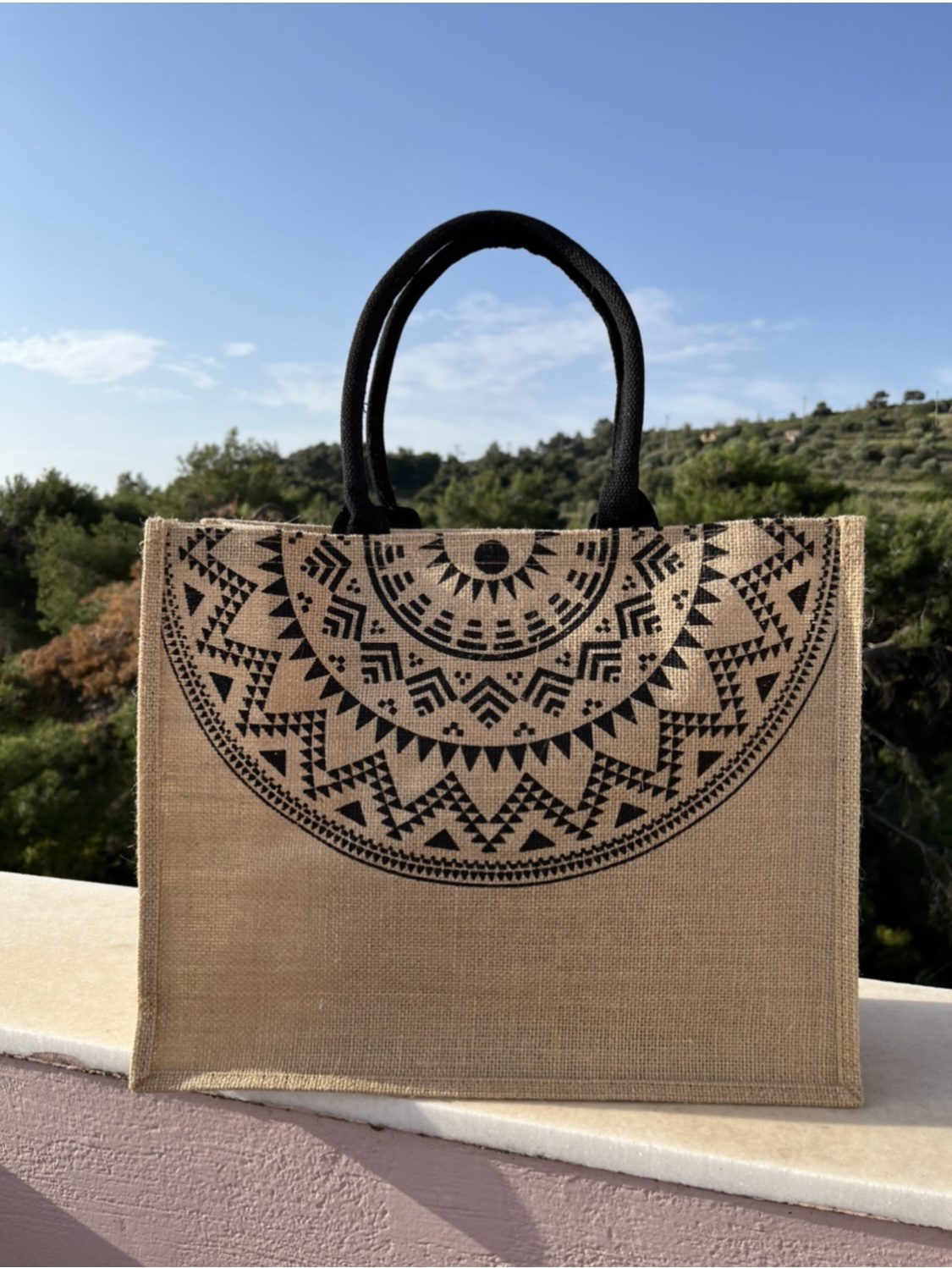 Τσάντα από λινάτσα με μαύρο τύπωμα.