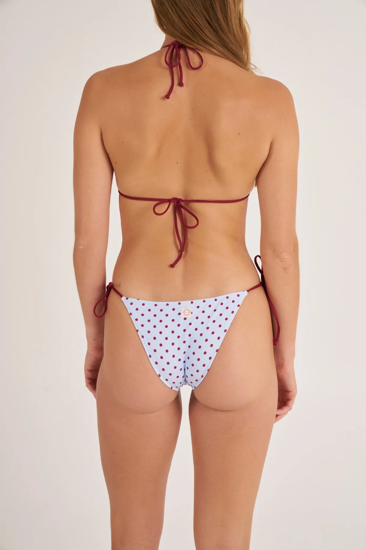 Κατασκευασμένο σε ένα πολύ κολακευτικό παστέλ λεβάντα χρώμα με μπορντό πουά τύπωμα, που ταιριάζει με τα μπορντό κορδονάκια.