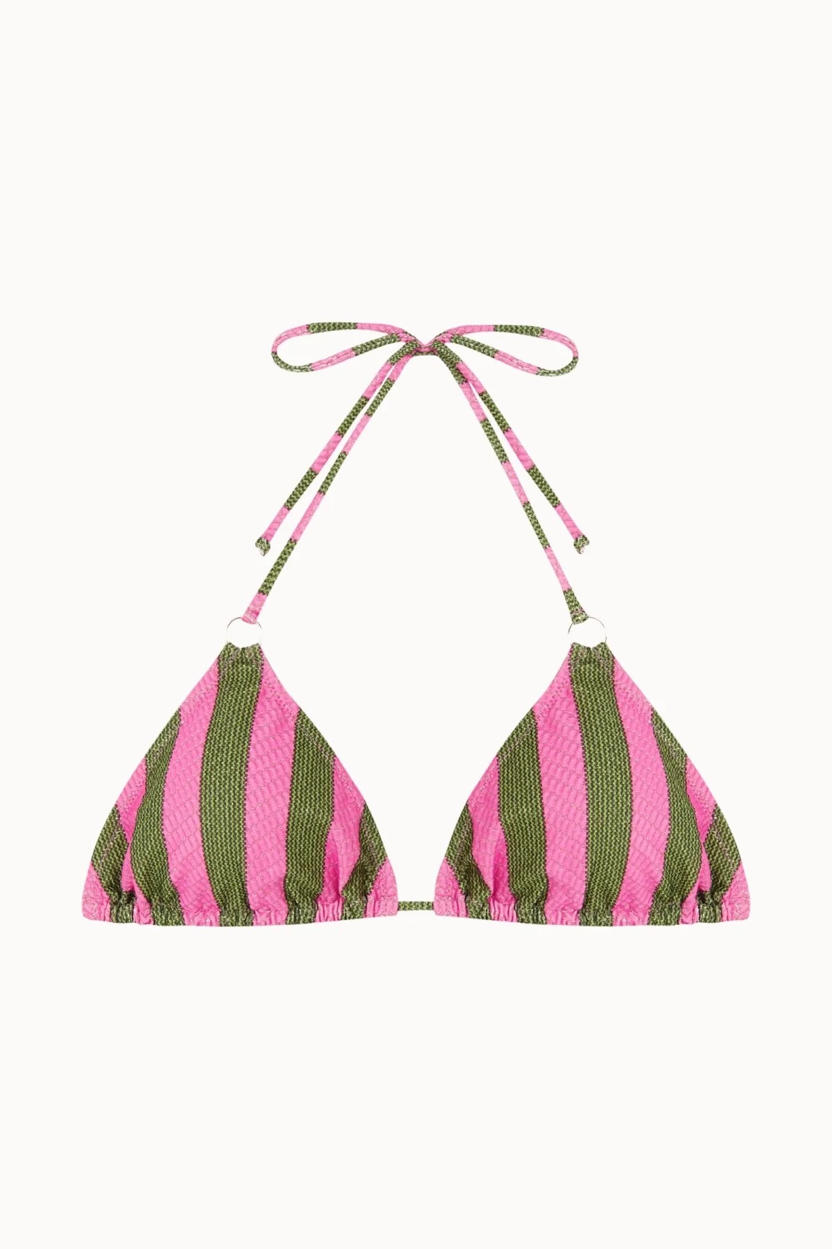 Το μπικίνι τοπ Nora Triangle με μπανέλα διαθέτει τριγωνικά cups και αφαιρούμενη επένδυση για φυσική, κολακευτική εφαρμογή. Ενσωματώνει δύο στρογγυλούς χρυσούς κρίκους στις τιράντες, προσθέτοντας μια λεπτή πινελιά με κοσμήματα.