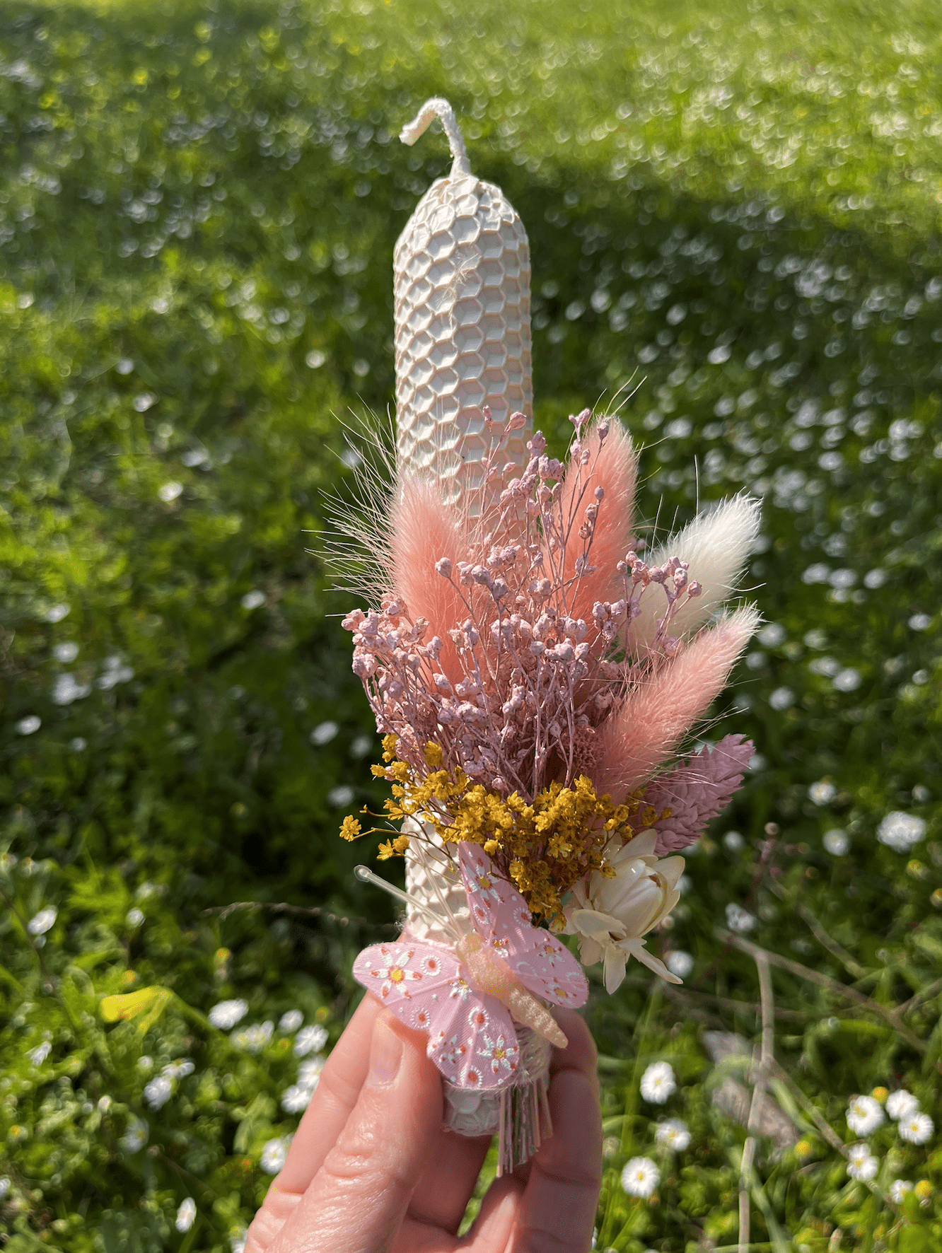 Μια υπέροχη λαμπάδα κηρήθρας με αποξηραμένα λουλούδια και διακοσμητική πεταλούδα με clip, που μας ταξιδεύει στις ανοιξιάτικες μέρες της Λαμπρής.