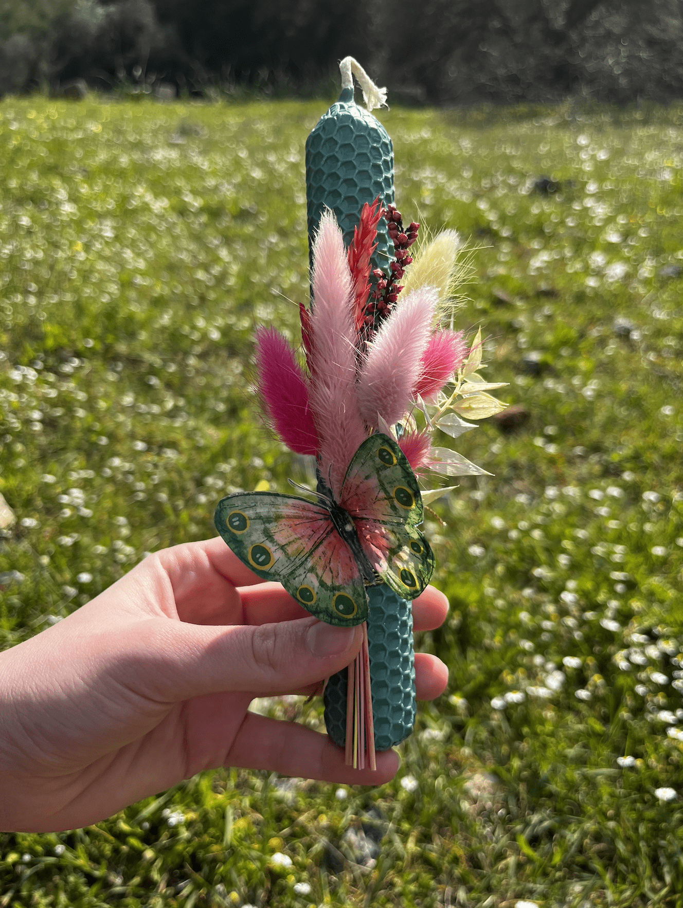 Μια υπέροχη λαμπάδα κηρήθρας με αποξηραμένα λουλούδια και διακοσμητική πεταλούδα με clip, που μας ταξιδεύει στις ανοιξιάτικες μέρες της Λαμπρής.