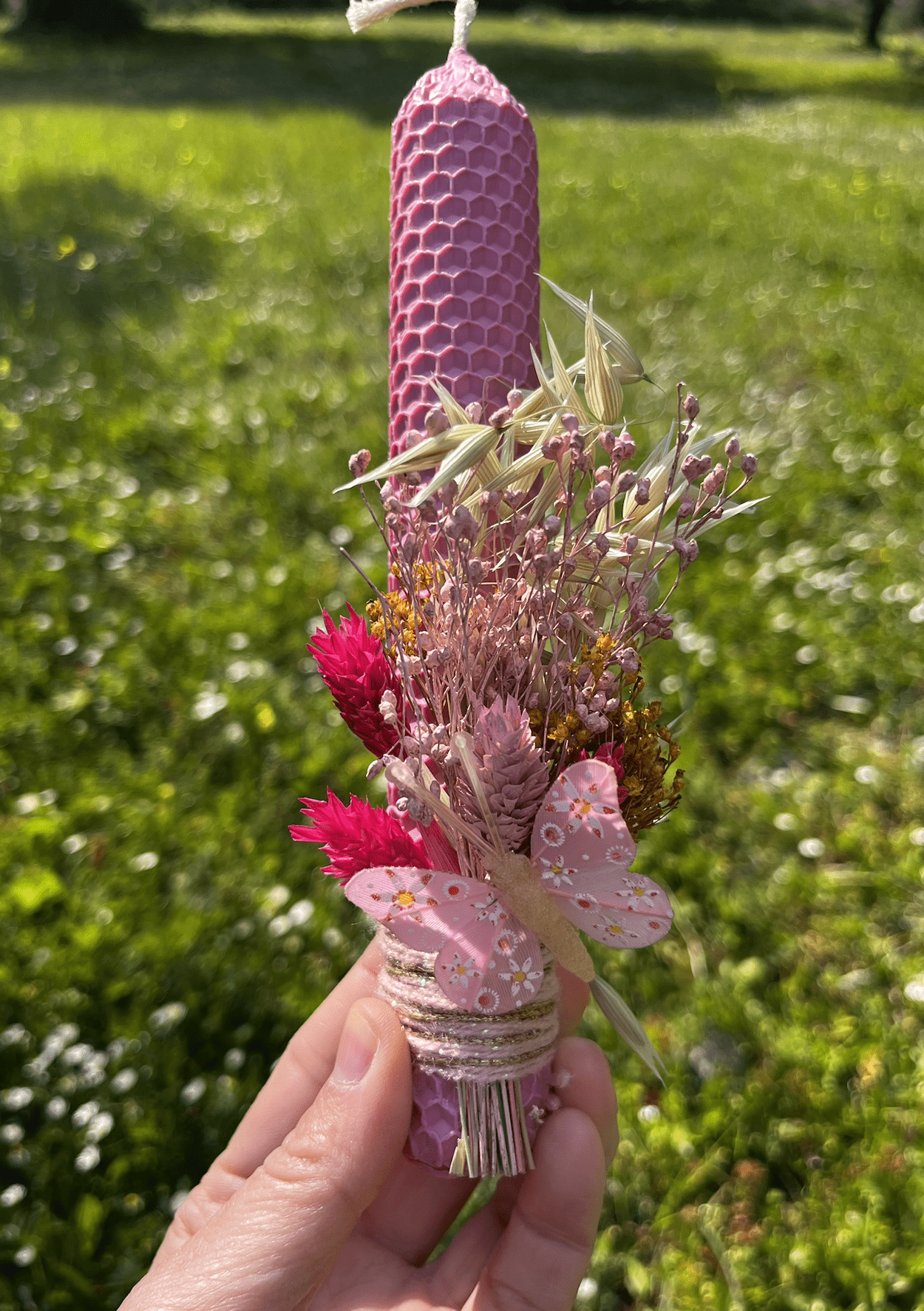Μια υπέροχη λαμπάδα κηρήθρας με αποξηραμένα λουλούδια και διακοσμητική πεταλούδα με clip, που μας ταξιδεύει στις ανοιξιάτικες μέρες της Λαμπρής.