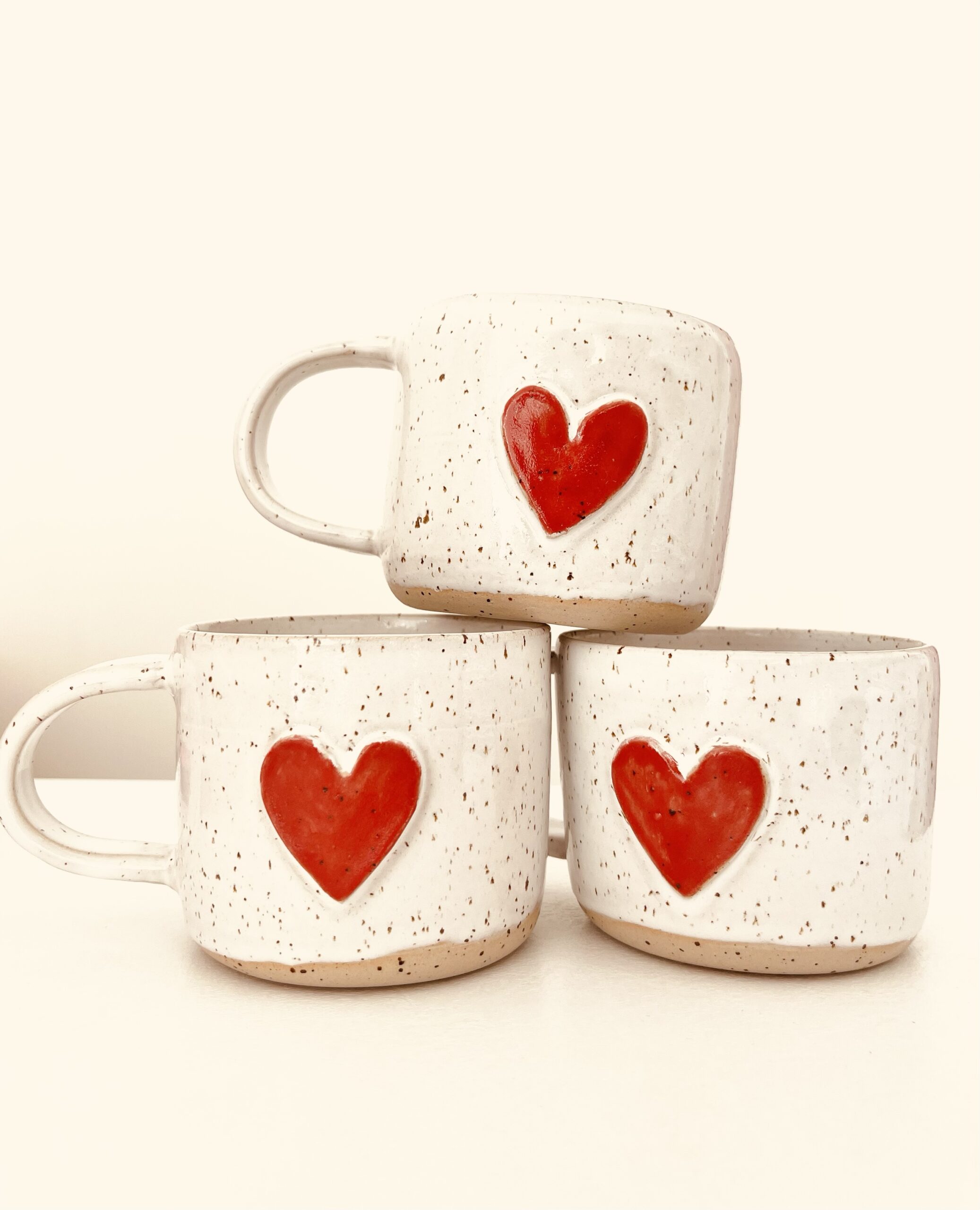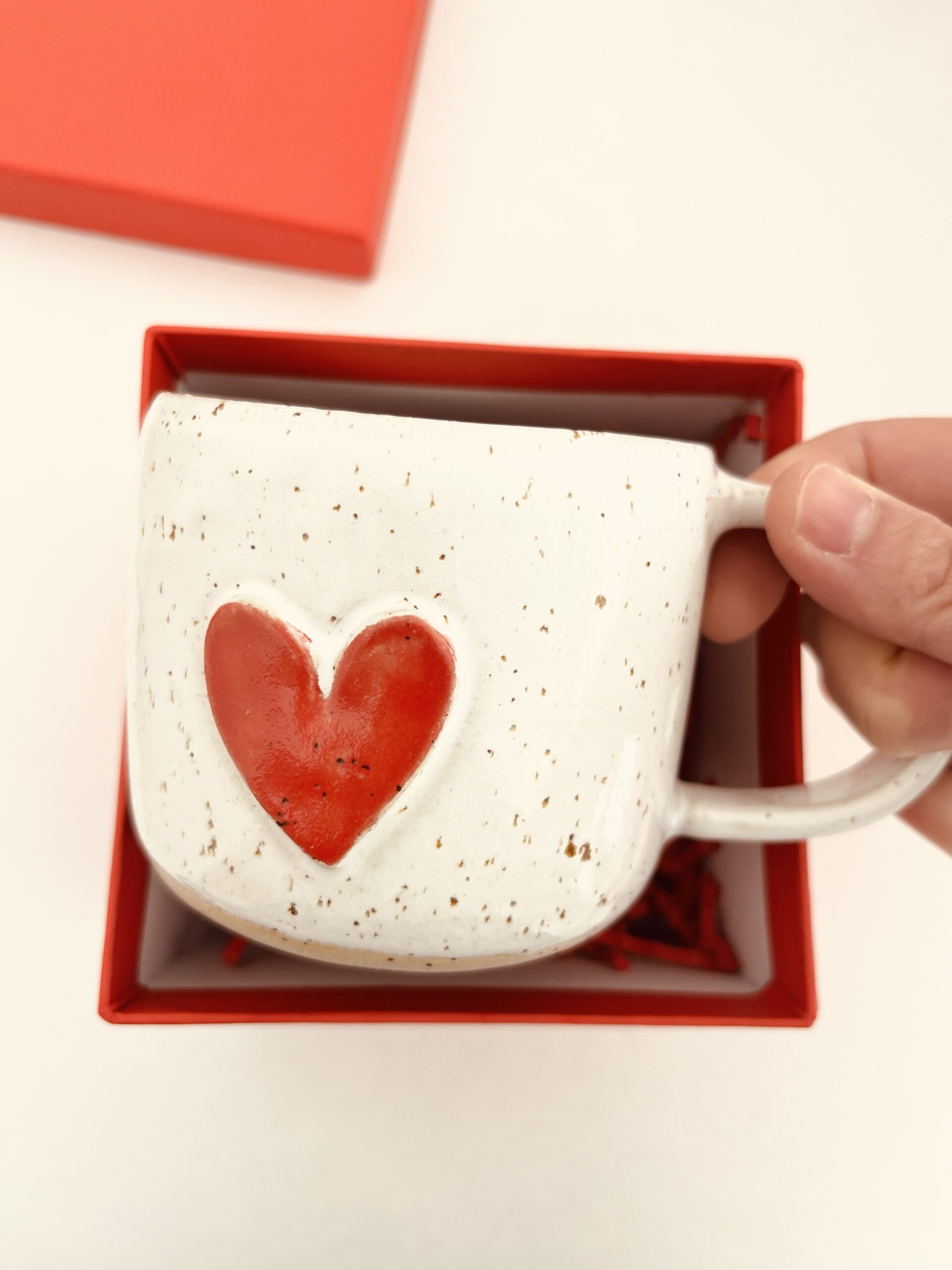 Χειροποίητη κεραμική κούπα με κόκκινη καρδιά που προεξέχει.